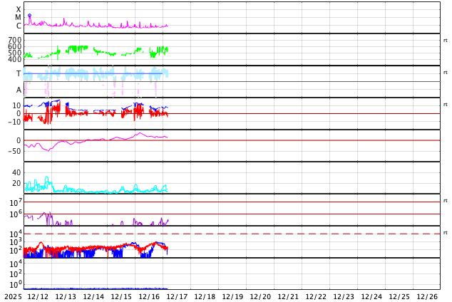 2025/12/17 13:51 更新 太陽風の速度は650km/秒まで高まり、高速の状態が続いています。北極航路の機内からのオーロラをどうぞ。 担当 篠原 アイスランドへオーロラ観測に向かう途中の 飛行機の中から撮影されたオーロラの写真を、 藤井哲也さんからいただきました。 アラスカから北極を越えてスカンジナビア半島に向かう航路で、 藤井さんより「オーロラファンにとってはうれしいコースです」とのことです。 1枚目は、アラスカを越えて北極点に達する少し前と、 かなり高緯度での撮影です。 現地は昼に近い時間帯で(極夜で暗い状態です)、 オーロラが現れやすい緯度は夜の時間帯よりも高くなっています。 ここで撮影できたのはこのことも関係しているのかもしれません。 2枚目はスカンジナビア半島に近づいての撮影とのことで、 現地はほぼ真夜中でした。 オーロラ観望には最適の場所と時間帯だったと言えそうです。 ただし、AE指数を見るとこの日のオーロラの活動はとても弱く、 オーロラの輝きとしては控えめだった様です。 藤井さんは、これからアイスランドで観測されるとのことです。 その最初の撮影情報をどうもありがとうございます。 昨日、500km/秒に高まっていた太陽風の速度は、 その後も上昇が続いて、昨夜遅くに650km/秒に達し、 その状態がしばらく続いて、 現在は少し下がっていますが、570km/秒と高速の状態が続いています。 SDO衛星AIA193の太陽コロナ写真を見ると、 (SDO衛星の画像を掲載するのは3か月ぶりです) 南北に細長く伸びるコロナホールは、西側(右側)にだいぶ進んでいます。 この領域の影響がやってきているのでしょうか。 太陽風の磁場強度は、12nTから7nT程度へ下がっています。 南北成分は、グラフの前半は北寄りでしたが、 後半は0nT付近で小さく変化する様になっています。 磁気圏の活動もこれに対応して、 AE指数は、グラフの前半は変化がありませんが、 途中から小規模の変化が続く様になっています。 速度が高まっていることもあり、 この後もある程度の活動が見られそうです。 SDO衛星AIA193では。東端(左端)に次のコロナホールが現れています。 5〜6日後くらいから、この領域の影響が始まりそうです。 太陽は、穏やかな状態です。 北東の端(左上)の少し向こう側で、 C1.5、C1.9、C1.1と小さいフレアが発生しています。 活発というほどではありませんが、 この後、黒点群が現れそうです。 9月15日からWebサーバーの故障のため停止していた SDO衛星のデータページがある程度回復した様で、 3か月ぶりに太陽コロナや可視光の写真を掲載しています。 停止している間は、 宇宙天気ニュースの中で手作業で対応していた部分があったので、 復活はとても助かります。 完全に復活することを期待しています。