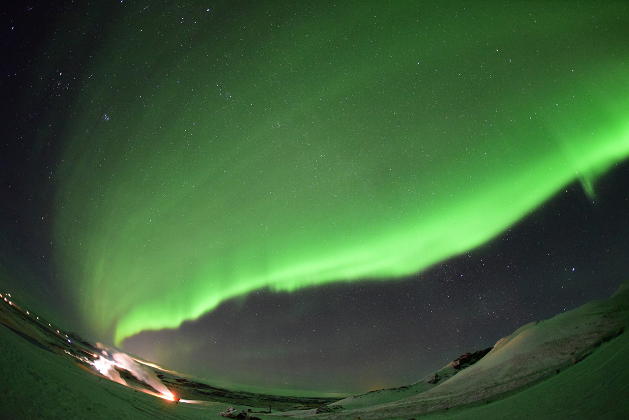 2025/12/18 12:13 更新 太陽風は650km/秒と高速です。アイスランドのオーロラをどうぞ。 担当 篠原 アイスランドに滞在中の藤井哲也さんと高家幹夫さんより、 現地17日未明に撮影されたオーロラの写真をいただきました。 撮影場所は、アイスランド北部にあるミーバトン湖とのことです。 撮影の頃は、太陽風の速度は600km/秒と高まっていたのですが、 磁場の南向きの変化が少なく、AE指数はほとんど変化のない穏やかな状況でした。 藤井さんによると、 オーロラは強くなったり弱くなったりを繰り返していたとのことで、 強い活動にはなっていなかった様です。 1枚目の写真は、魚眼レンズによる全天の写真です。 東側から昇ったオーロラと西側から昇ったオーロラが、 やがてこの写真の様に、きれいに一つに繋がったとのことです。 緑色の光から赤色の光へ上がっていく様子がとてもきれいです。 左上の低空にオリオン座が見えています。 さすが高緯度地域です。 その後、つながったオーロラが動き始めて、太くなり(2枚目)、 強くなったり弱くなったりを繰り返していたそうです(3枚目)。 現地は快晴で、気温はマイナス13度まで下がっていたそうです。 きれいなオーロラの姿をありがとうございます。 太陽風の速度は、600km/秒から650km/秒へ再び高まっています。 SDO衛星AIA195を見ると、南北に縦に伸びるコロナホールは、 西側(右側)にだいぶ進んでいて、この領域の影響がやって来ているようです。 太陽風の磁場強度は、5nT前後と平均的な状態です。 磁場の南北成分は、南北に変化していて、 -5nT程度の南向きの変化も発生しています。 このため、磁気圏の活動は強まっていて、 AE指数は、途中から500nT程度の変化が発生するようになり、 後半では800nTと中規模の変化に達しています。 今回の太陽風速度の高まりに関係していると思われる 太陽の西側のコロナホールは、 縦に伸びていて横方向の広がりは小さいです。 このため、太陽風の高速の状態はあまり長く続かない様に思います。 この後の速度の変化に注目してください。 また、東側(左側)に次のコロナホールが見えています。 5日後くらいから、この領域の影響が始まりそうです。 太陽のX線強度のグラフは、変化が少なくなっています。 太陽は穏やかな状態です。 可視光写真では、北東の端(左上)に新しい黒点群が現れていますが、 特に活動は起こしていません。