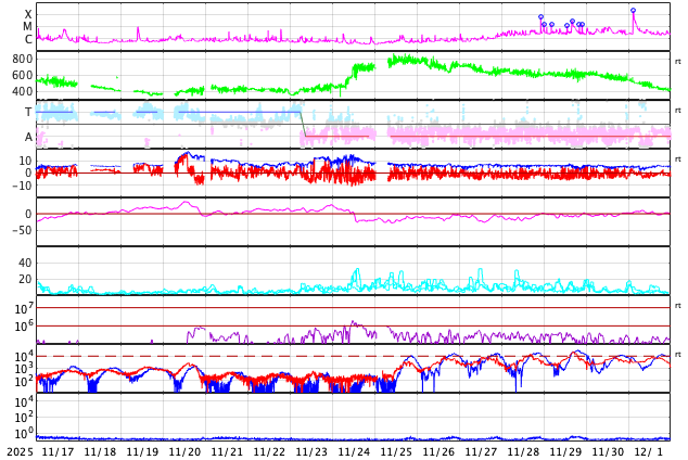 GOES衛星の太陽X線強度。赤・橙 = 0.1〜0.8 nm、青・紫 = 0.05〜0.4 nm (c) データ:NOAA/SWPC、作図:宇宙天気ニュース ![]() | ||||||||||||||||||||||||||||||||||||||||||||||||||||||||||||||||||||||||||||||||||||||||||||||||||||||||||||||||||||||||||||||||||||||||||||||||||||||||||||||||||||||||||||||||||||||||||||||||||||||||||||||||||||||||||||||||||||||||||||