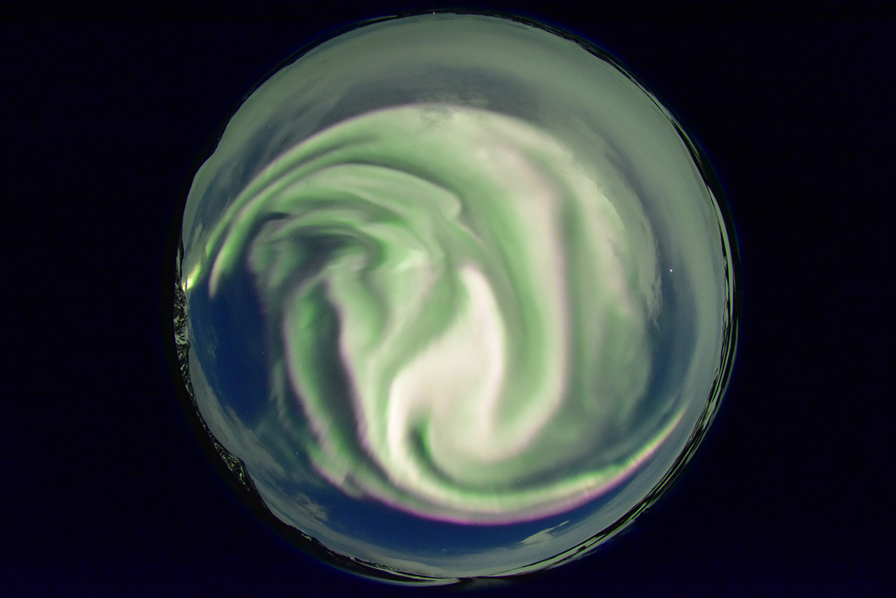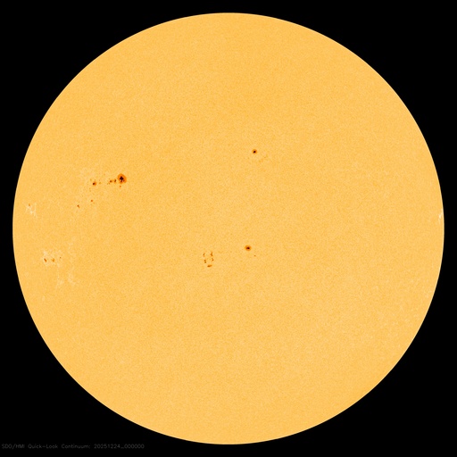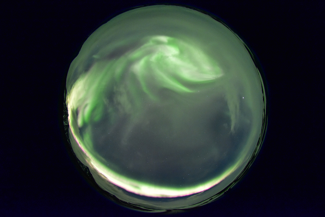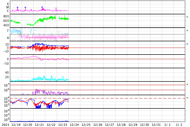 2025/12/24 09:53 更新 高速の太陽風が続き、磁気圏も活動的です。アイスランドのオーロラをどうぞ。 担当 篠原 アイスランドに滞在中の藤井哲也さんと高家幹夫さんより、 現地22日に撮影されたオーロラの写真をいただきました。 太陽風の速度は700km/秒とかなり高く、 AE指数は、22時頃まで700nT程度の中規模の変化が続いていました。 現地は、20時から21時半くらいまで晴れ間があったそうで、 ちょうど良いタイミングで観測できた様です。 光害のほとんどない場所で、月明かりもなく理想的な観測条件だったそうです。 1枚目は晴れてオーロラが見え始めた頃で、2枚目で少し強くなり、 3枚目で一気に激しい輝きが空を覆っています。 4枚目はその1分後とのことで、 短い時間にオーロラの姿が大きく変わる様子が想像できます。 5枚目は、北の空を撮影したもので、 右側に北斗七星、その左に北極星、 上側の真ん中付近にカシオペヤ座が見えています。 山に積もった雪がオーロラに照らされて、 緑色に見えているのがとてもきれいです。 この後、空は雲に覆われてしまったそうです。 最初の頃の写真と比較すると、 太陽風が強まってオーロラの活動が活発になっている様子がとてもよく分かります。 一週間にわたる観測の報告をどうもありがとうございます。 現在の太陽風は、速度が700km/秒から680km/秒へ少し下がっています。 速度がかなり高まっている状態は続いています。 磁場強度は6nT前後で、平均的な状態です。 磁場の南北成分は、弱い南寄りになっています。 磁気圏の活動は活発で、 AE指数は、500〜800nTの中規模の変化が次々に発生しています。 藤井さんの報告の様に、 極域では賑やかなオーロラが続いているのではないでしょうか。 SDO衛星AIA193の太陽コロナ写真を見ると、 高速の太陽風をもたらしているコロナホールは、 西側(右側)の赤道付近から、左下へ向かって南半球の高緯度側に広がり、 その左側では中緯度側へ上がっています。 この左側の広がりは、前周期は見られなかった領域で、 この部分からも影響がやって来ると考えると、 太陽風の強まりは、この後も1週間程度続くかもしれません。 太陽は、X線グラフに目立った変化はなく、 穏やかな状態です。 可視光写真では、黒点が増えて少し賑やかになっています。
