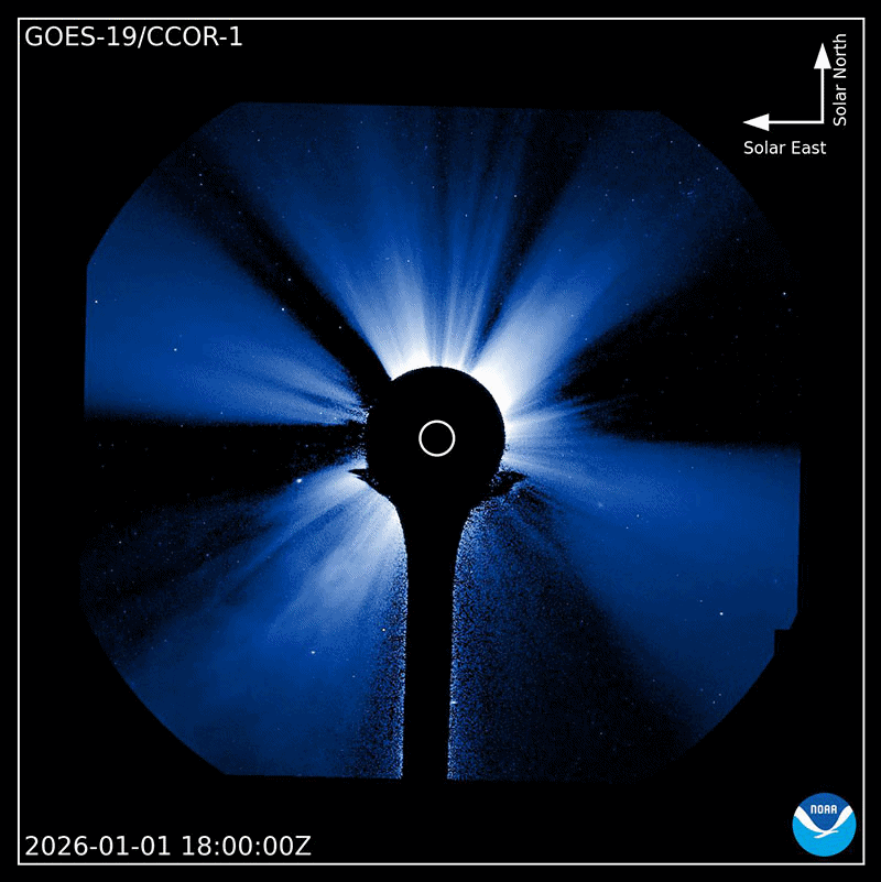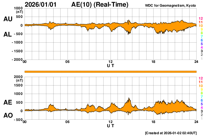 2026/ 1/ 2 12:00 更新 太陽風はやや高速です。C6.2の小規模フレアによりハロー型のCMEが発生しています。 担当 篠原 昨日のニュースの後、太陽風の速度は460km/秒に少し下がり、 その後再び上がって、480km/秒とやや高速の状態に戻っています。 SDO衛星AIA193の太陽コロナ写真を見ると、 北半球のコロナホールは、北東の端(右上)に近付いていて、 今回の太陽風速度の高まりは、この程度で終わりそうです。 27日周期の図を見ると、 前周期の太陽風速度は600km/秒台に高まっていたのですが、 今回はこの高まりがほとんど消えた様になっています。 太陽風の磁場強度は、 10nTに近い状態から、7nT程度へ下がっている様です。 南北成分は、グラフの前半は北寄りですが、 途中から南寄りで変化する様になっています。 磁気圏の活動もこの影響で少し強まっていて、 AE指数は、600nTの中規模の変化が続く様になっています。 SDO衛星AIA193の太陽の中心部にはコロナホールは見られず、 この後、太陽風の速度は低下して、 穏やかな状態がしばらく続きそうです。 太陽では、今日未明、2日2時半(世界時1日17時半)に、 中心部北側(上側)の4324黒点群で、C6.2の小規模フレアが発生しました。 SDO衛星AIA131の動画を掲載します。 この動画では、フレアに伴ってコロナのガスが飛び出す様子が見えています。 GOES衛星CCOR1では、CME(コロナ質量放出)が観測されています。 CMEは、太陽の左上に濃く広がっていますが、 左下や右側にも淡く飛び出す様子が見えていて、 ハロー型のCMEになっている様です。 フレアの発生位置から考えても、 CMEの噴出は地球にも向かっているのではないでしょうか。 到来まで3日くらいかかると考えると、5日の午前中くらいでしょうか。 X線グラフの最後で、C6.5の小規模フレアが発生しています。 太陽の中心部南東側(左下)の黒点群で発生しています。