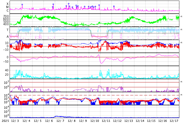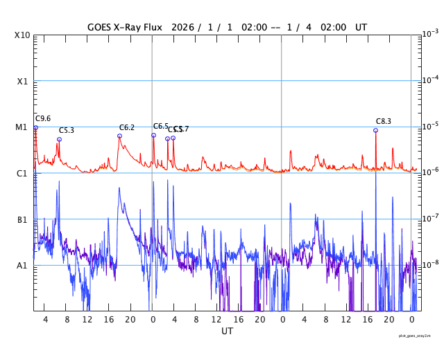 GOES衛星の太陽X線強度。赤・橙 = 0.1〜0.8 nm、青・紫 = 0.05〜0.4 nm (c) データ:NOAA/SWPC、作図:宇宙天気ニュース ![]() | ||||||||||||||||||||||||||||||||||||||||||||||||||||||||||||||||||||||||||||||||||||||||||||||||||||||||||||||||||||||||||||||||||||||||||||||||||||||||||||||||||||||||||||||||||||||||||||||||||||||||||||||||||||||||||||||||||||||||||||||||||||||