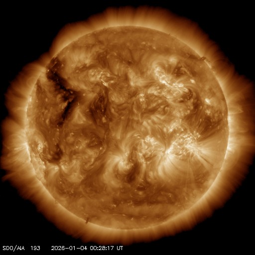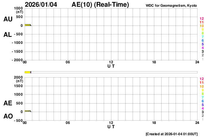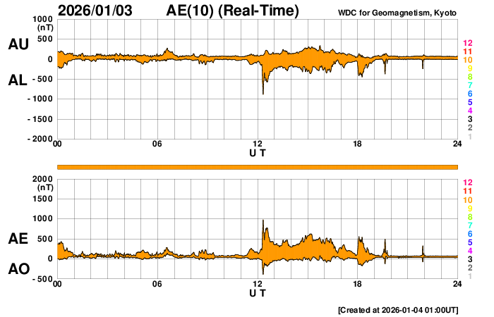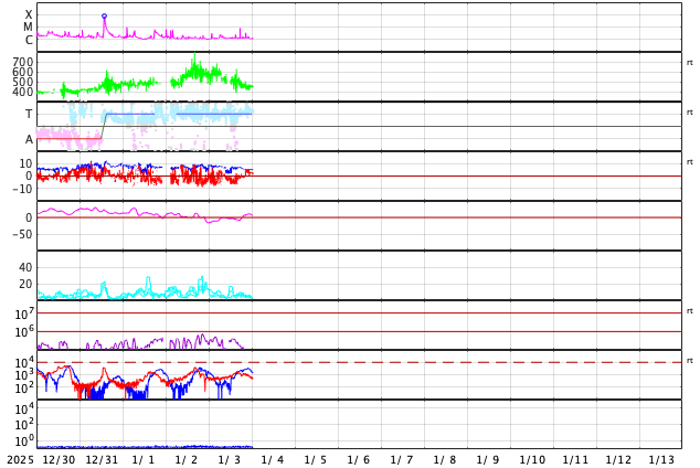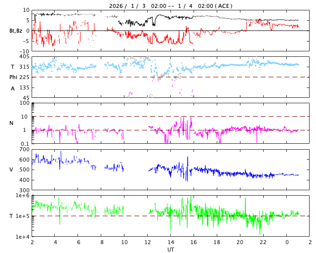 2026/ 1/ 4 10:15 更新 太陽風は平均的な速度に戻っています。磁気圏は穏やかです。 担当 篠原 太陽風の速度は、昨日の夕方にかけて580km/秒の状態が続き、 その後、500km/秒へ下がり、 今朝には450km/秒へ下がって、平均的な速度に戻っています。 磁場強度は、8nTから5nTへ下がり、 こちらも平均的な状態です。 12月31日のCME(コロナ質量放出)による乱れは、 はっきり分かる様な変化は起きていない様です。 元々、CMEは斜め方向に濃く飛び出していたので、 地球方向は、目立つほどの変化にはならなかったのかもしれません。 引き続き、世界時1日に発生したC6.2小規模フレアの CMEの乱れに注目して下さい。 NOAA/SWPCの太陽風予報では、今夜くらいに到来すると考えられています。 太陽風磁場の南北成分は、 グラフの中盤で、-5nT程度の南向きの変化が発生しています。 これに対応して、AE指数では500〜1000nTの中規模の変化が発生しています。 現在の磁場は北向きになっていて、磁気圏は穏やかです。 SDO衛星AIA193を見ると、 太陽の北東側(左上)にコロナホールが見えています。 この領域は前周期にもあって、27日周期の図を見ると、 5日後にあたる12月13日から太陽風の速度が高まっています。 今回は、1月9日頃でしょうか。 太陽は、南西(右下)の4325黒点群でC8.3の小規模フレア、 北西(右上)の4324群でC3.5の小規模フレアが発生しています。 全体としては穏やかな様子です。 ![]() SDO衛星のAIA193カメラによる太陽コロナの様子 (c) SDO (NASA) ![]() SDO衛星による太陽の可視光写真。マウスの矢印を写真に重ねると、黒点番号付きの写真に切り替わります。 (c) SDO (NASA) ![]() ACEが観測した太陽風の磁場(黒線は全体の強度、赤線は南北成分) 磁場の向き、プラズマの密度、速度、温度 (c) データ:NOAA/SWPC、作図:宇宙天気ニュース ![]() AE指数(速報値) 下段のAEグラフの値が高くなると、オーロラ活動が活発化しています。 (c) 京都大学WDC ![]() ![]() 27日の太陽周期に合わせた図 太陽が同じ面を地球に向けていた27日前の変化から、今後を予想することができます。 (c) 作図:宇宙天気ニュース