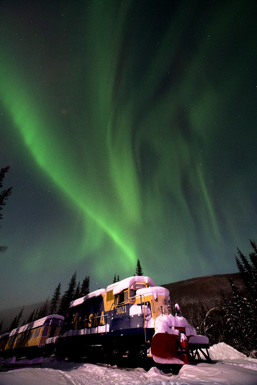 2026/ 1/ 6 12:45 更新 太陽風は低速になっています。フェアバンクスのオーロラをどうぞ。 担当 篠原 臼井元明さんより、アラスカ・フェアバンクスで、 年末に撮影されたオーロラの写真をいただきました。 1枚目は、現地12月28日23時45分(世界時29日8時45分)の撮影で、 太陽風の速度は450km/秒と平均的な状態で、磁場が弱い南向きに変化して、 AE指数では600nTの中規模の変化が発生した頃でした。 フェアバンクスの郊外での撮影とのことで、動きのあるオーロラだったそうです。 雪原が印象的です。 2枚目は、大晦日の未明の現地12月31日1時31分(世界時31日10時31分)。 ちょうどこの頃に、AE指数は700nTの短い時間の強まりが発生していて、 この活動を捉えたのかもしれません。 手前に写っているのは、チェナ温泉入口に展示のアラスカ鉄道車両とのことです。 満月に近く、夜空のコンディションはあまり良くなかったそうですが、 風景が撮影できたので楽しく過ごせたとのことです。 臼井さんからは、2012〜2017年にかけて毎年の様にオーロラの写真をいただいていました。 今回も、2025年最後のオーロラをどうもありがとうございます。 太陽風は、速度が450km/秒から370km/秒に下がり、 低速になっています。 磁場強度は、10nTから7nTに少し下がっています。 磁場の南北成分は、南寄りの傾向が続いています。 AE指数は、グラフの前半は500nTくらいの変化が発生していて、 磁気圏はある程度活動的でした。 しかし、グラフの途中から変化が見られなくなっています。 現在の磁気圏は穏やかになっている様です。 SDO衛星AIA193では、北半球のコロナホールの先頭(右端)が、 太陽の中心線に達したところです。 3日後の9日くらいから、この領域の影響で太陽風の速度が高まる可能性があります。 27日周期の図を見ると、前周期は650km/秒くらいまで高まっています。 今回はどの様な太陽風がやってくるでしょうか。 太陽は、南東(左下)の4334黒点群で、C3.0、C2.1の小規模フレア、 南西(右下)の4333群でC3.3の小規模フレアが発生しています。 全体としては、穏やかな状態です。
