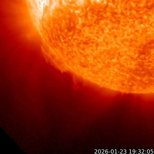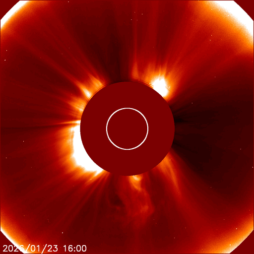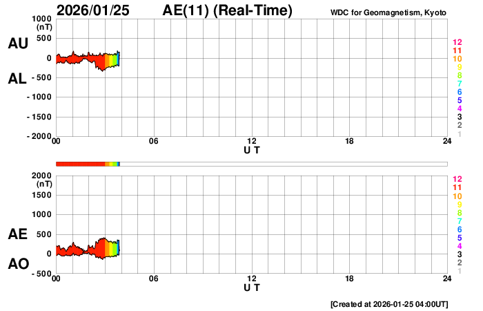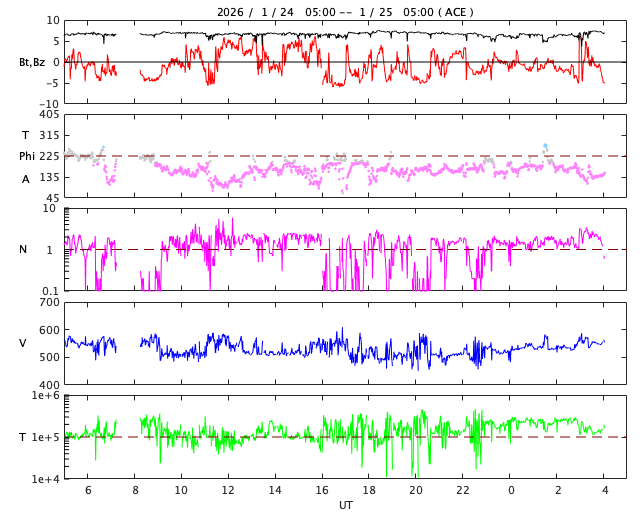 2026/ 1/25 13:17 更新 太陽風は高速の状態が続いています。磁気圏んはやや活動的です。 担当 篠原 太陽風は、500〜550km/秒と高速の状態が続いています。 磁場強度は、6〜7nTと平均的な値で推移しています。 磁場の南北成分は、 南寄りになったり北寄りになったりしています。 磁気圏の活動も、700nT前後の中規模の変化が発生したり、 変化がなくなったりと、強弱が切り替わっています。 SDO衛星AIA193では、 南半球のコロナホールは南西の端(右下)へ進んでいます。 影響は次第に弱まりそうです。 一方、中心部の北側(上側)に小さいコロナホールが見えています。 3日後くらいからこの領域の影響が到来しそうです。 太陽風速度の高まりはどの程度になるでしょうか。 昨日の早い時間帯になりますが、 24日3時(世界時23日18時)頃と、24日7時(世界時23日22時)頃に、 太陽の南東側(左下)へ飛び出すCME(コロナ質量放出)が発生しました。 SOHO衛星LASCO C、C3とGOES衛星CCOR-1の動画を掲載します。 GOES衛星SUVIカメラの動画を見ると、 1つめのCMEは太陽の向こう側で発生した様に思われます。 2つめは南東の端でプロミネンス噴出が発生していて、 GOES衛星SUVI 304の動画を掲載します。 太陽は、C2〜4の小規模フレアが数回発生した程度で、 穏やかな状態です。 ![]() 太陽の南東側で発生した2つのCME. (c) SOHO衛星LASCO C2、C3 (ESA & NASA)、(動画加工 : 宇宙天気ニュース) ![]() GOES衛星による同じCMEの動画。 (c) GOES衛星CCOR-1 (NOAA)、(動画加工 : 宇宙天気ニュース) ![]() 2つめのCMEの頃に発生したプロミネンス噴出。 (c) GOES衛星SUVI 304 (NOAA)、(動画加工 : 宇宙天気ニュース) ![]() SDO衛星のAIA193カメラによる太陽コロナの様子 (c) SDO (NASA) ![]() SDO衛星による太陽の可視光写真。マウスの矢印を写真に重ねると、黒点番号付きの写真に切り替わります。 (c) SDO (NASA) ![]() ACEが観測した太陽風の磁場(黒線は全体の強度、赤線は南北成分) 磁場の向き、プラズマの密度、速度、温度 (c) データ:NOAA/SWPC、作図:宇宙天気ニュース ![]() AE指数(速報値) 下段のAEグラフの値が高くなると、オーロラ活動が活発化しています。 (c) 京都大学WDC ![]() ![]() 27日の太陽周期に合わせた図 太陽が同じ面を地球に向けていた27日前の変化から、今後を予想することができます。 (c) 作図:宇宙天気ニュース