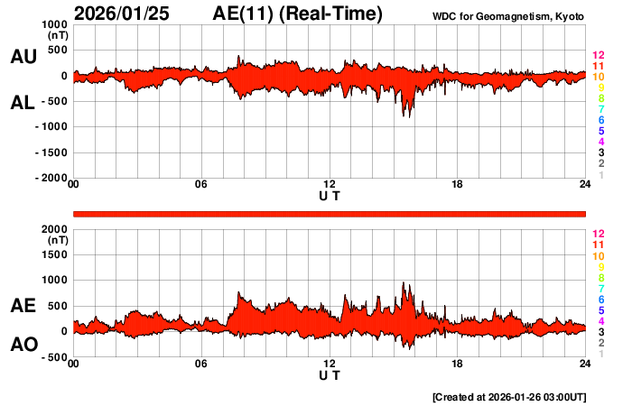 下段のAEグラフの値が高くなると、オーロラ活動が活発化しています。