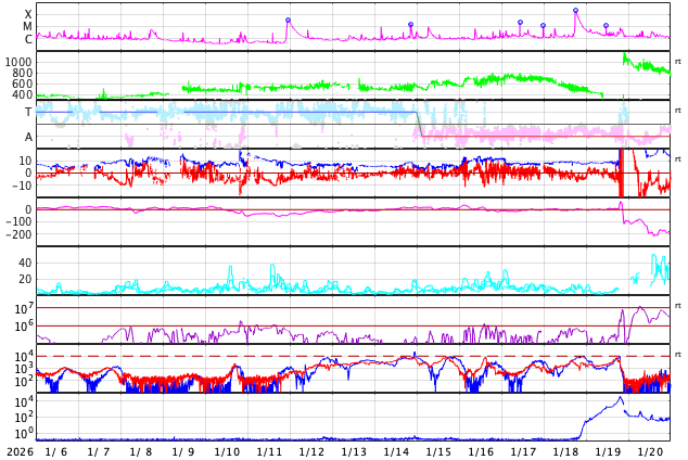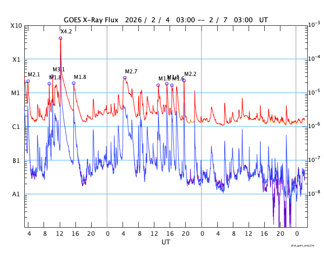 GOES衛星の太陽X線強度。赤・橙 = 0.1〜0.8 nm、青・紫 = 0.05〜0.4 nm