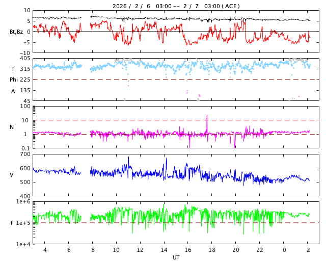2026/ 2/ 5 12:42 太陽風の乱れが到来し、磁場が南向きに強まって磁気圏の活動が強まりそうです。X4.2の大規模フレアが発生しました。