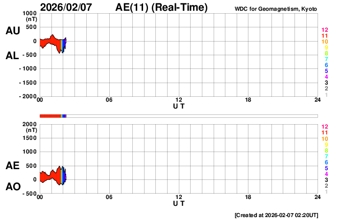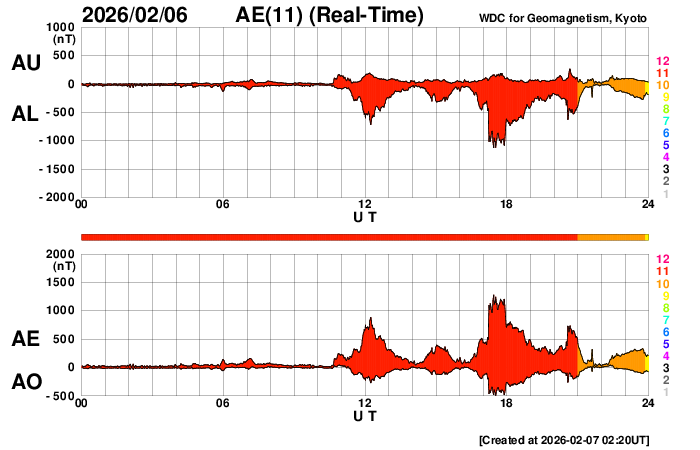 下段のAEグラフの値が高くなると、オーロラ活動が活発化しています。