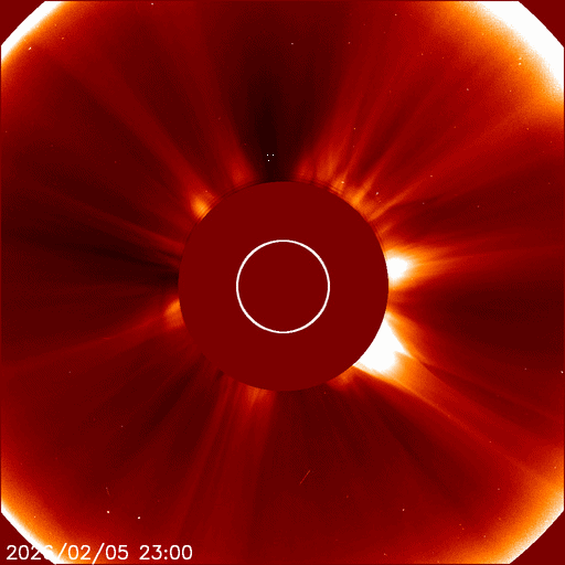 2026/ 2/ 6 13:59 太陽風の速度は600km/秒に高まりました。太陽の向こう側でCMEが発生しています。