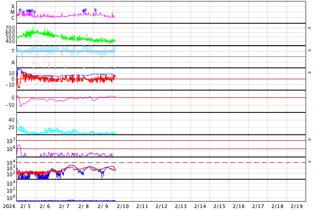 2026/ 2/10 12:51 更新 太陽風は平均的な状態で、磁気圏も穏やかです。 担当 篠原 太陽風は、400km/秒と平均的な速度が続いています。 磁場強度は、9nTに少し強まっていましたが、 グラフの最後で6nTに下がり、平均的な値に戻っています。 磁場の南北成分は、0nT付近で変化しています。 磁気圏は穏やかで、AE指数は小さい変化が時々発生する程度です。 SDO衛星AIA193では、 北西側(右上)のコロナホールは太陽の端に近づいていて、 影響は特に見られないままになりそうです。 一方、南東の端(左下)に縦に伸びるコロナホールが見えています。 この領域は、27日前の前周期とは位置や広がりがだいぶ変わっています。 現在の広がりはどのようになっているでしょうか。 太陽は、今朝、10日8時(9日23時)に、 北東の端(左上)の4374黒点群で、 C9.2と大きい小規模フレアが発生しました。 目立った変化はこのくらいで、全体としては穏やかな状態です。