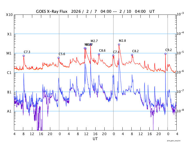 GOES衛星の太陽X線強度。赤・橙 = 0.1〜0.8 nm、青・紫 = 0.05〜0.4 nm (c) データ:NOAA/SWPC、作図:宇宙天気ニュース ![]() | ||||||||||||||||||||||||||||||||||||||||||||||||||||||||||||||||||||||||||||||||||||||||||||||||||||||||||||||||||||||||||||||||||||||||||||||||||||||||||||||||||||||||||||||||||||||||||||||||||||||||||||||||||||||||||||||||||||||||||||||||||||||||||||||||||||||||||||||||||||||