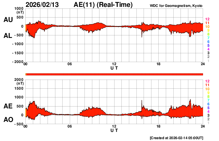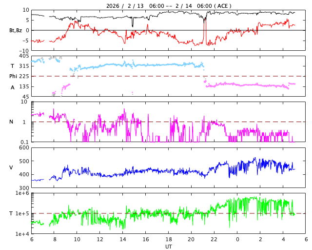 2026/ 2/14 14:16 更新 太陽風磁場が南寄りになって、磁気圏活動が度々発生しています。 担当 篠原 太陽風の速度は、400km/秒から470km/秒へ少し上がっています。 磁場強度は、7〜8nTと少し強まった状態です。 磁場の南北成分は、-5nTと南向きに強まる変化が起きています。 磁気圏の活動もある程度強まって、 AE指数は500nTの中規模の変化が度々発生しています。 グラフの最後は北向きになっていますが、 この後はどのように推移するでしょうか。 SDO衛星AIA193では、 太陽の中心部から南東の端(左下)に向かって コロナホールが細長く伸びています。 明後日くらいから太陽風の速度が高まりそうです。 太陽は、北西(右上)の4373黒点群で M1.0の中規模フレアが発生しました。 その他は特に変化はなく、全体として太陽は穏やかです。 可視光写真では、小さい黒点があちこちに新しく現れています。 ![]() SDO衛星のAIA193カメラによる太陽コロナの様子 (c) SDO (NASA) ![]() SDO衛星による太陽の可視光写真。マウスの矢印を写真に重ねると、黒点番号付きの写真に切り替わります。 (c) SDO (NASA) ![]() ACEが観測した太陽風の磁場(黒線は全体の強度、赤線は南北成分) 磁場の向き、プラズマの密度、速度、温度 (c) データ:NOAA/SWPC、作図:宇宙天気ニュース ![]() AE指数(速報値) 下段のAEグラフの値が高くなると、オーロラ活動が活発化しています。 (c) 京都大学WDC ![]() ![]() 27日の太陽周期に合わせた図 太陽が同じ面を地球に向けていた27日前の変化から、今後を予想することができます。 (c) 作図:宇宙天気ニュース