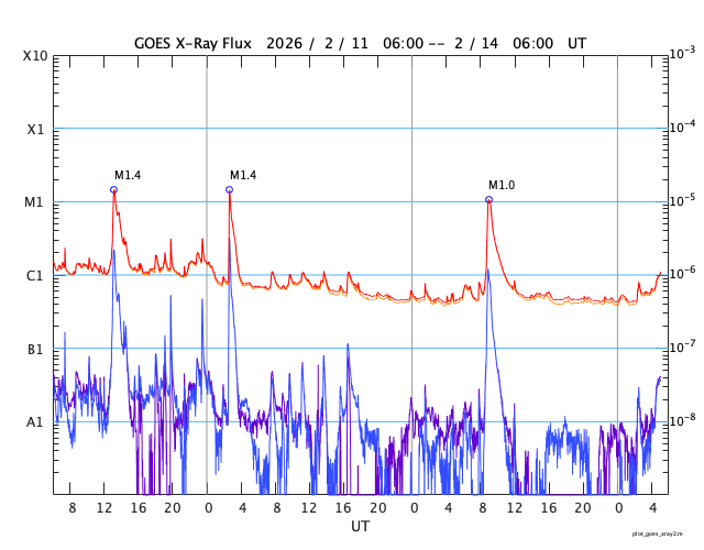 GOES衛星の太陽X線強度。赤・橙 = 0.1〜0.8 nm、青・紫 = 0.05〜0.4 nm (c) データ:NOAA/SWPC、作図:宇宙天気ニュース ![]() | ||||||||||||||||||||||||||||||||||||||||||||||||||||||||||||||||||||||||||||||||||||||||||||||||||||||||||||||||||||||||||||||||||||||||||||||||||||||||||||||||||||||||||||||||||||||||||||||||||||||||||||||||||||||||||||||