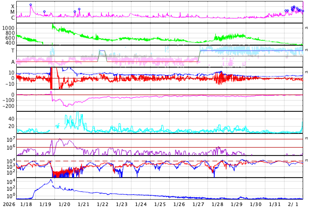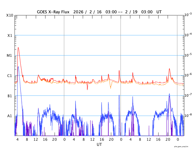 GOES衛星の太陽X線強度。赤・橙 = 0.1〜0.8 nm、青・紫 = 0.05〜0.4 nm