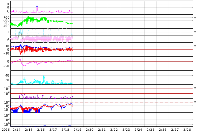 2026/ 2/15 13:38 太陽風の速度が600km/秒に高まり、磁気圏の活動も強まっています。
