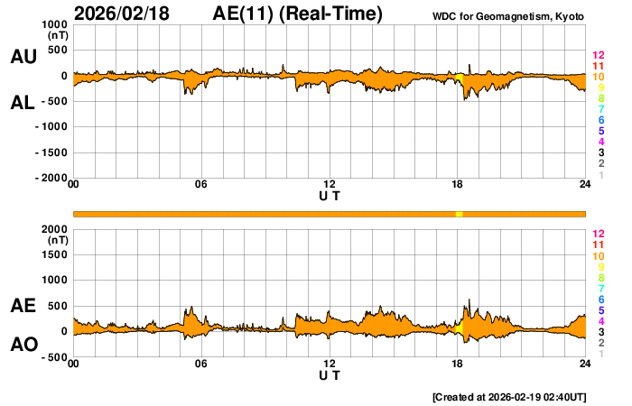 下段のAEグラフの値が高くなると、オーロラ活動が活発化しています。