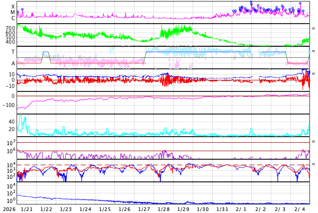 (c) SDO (NASA) ![]() SDO衛星による太陽の可視光写真。マウスの矢印を写真に重ねると、黒点番号付きの写真に切り替わります。 (c) SDO (NASA) ![]() GOES衛星の太陽X線強度。赤・橙 = 0.1〜0.8 nm、青・紫 = 0.05〜0.4 nm (c) データ:NOAA/SWPC、作図:宇宙天気ニュース ![]() ACEが観測した太陽風の磁場(黒線は全体の強度、赤線は南北成分) 磁場の向き、プラズマの密度、速度、温度 (c) データ:NOAA/SWPC、作図:宇宙天気ニュース ![]() AE指数(速報値) 下段のAEグラフの値が高くなると、オーロラ活動が活発化しています。 (c) 京都大学WDC ![]() ![]() 27日の太陽周期に合わせた図 太陽が同じ面を地球に向けていた27日前の変化から、今後を予想することができます。 (c) 作図:宇宙天気ニュース