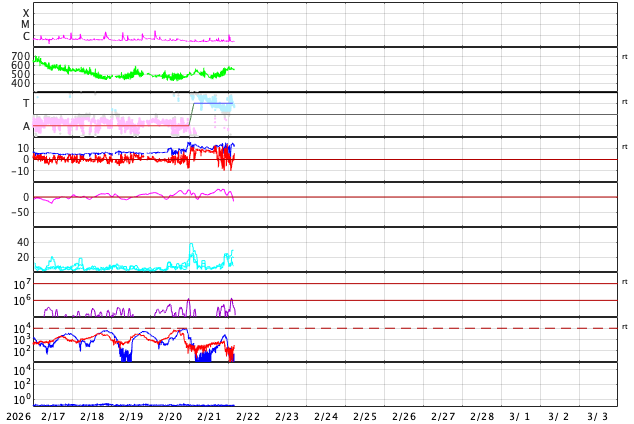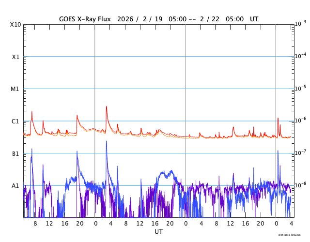 2026/ 2/22 13:12 更新 太陽は無黒点に近い状態です。高速の太陽風が続いています。 担当 篠原 太陽は、北西の端(右上)にあった4374黒点群が 向こう側に進んで見えなくなり、 無黒点に近い状態になっています。 それでも、SDO衛星の可視光写真を拡大すると、 小さい黒点が所々に見えている様で、 掲載の写真では、 中心部南東側(左下)に小さい点を見つけることができます。 WDC-SILSOの記録としては、今日の黒点相対数はどうなるでしょうか。 X線グラフでは、C1の小さいフレアが発生しています。 北西の端に沈んだ4374群で起きています。 太陽風は、速度が500km/秒から550km/秒に高まり、 より高速になっています。 磁場強度も10〜15nTと強まった状態です。 磁場の南北成分は、前半は北向きでしたが、 途中から南北に大きく変化する様になっています。 磁気圏の活動も、穏やかな状態からやや強まった状態に変わっていて、 AE指数は、変化のない時間帯が半日ほど続いた後、 500nTくらいの小、中規模の変化が続くようになっています。 SDO衛星AIA193では、北半球のコロナホールが西側(右側)に進んでいます。 1〜2日後くらいから、この領域の影響が強まりそうです。