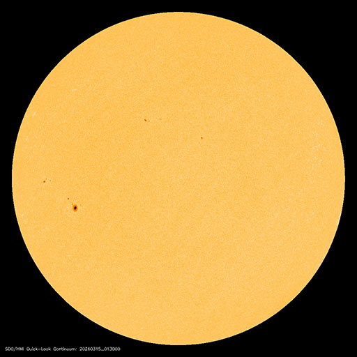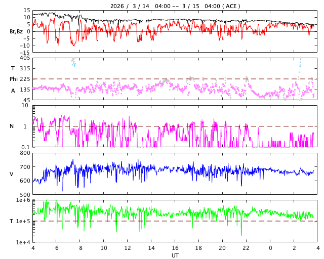 2026/ 3/15 12:54 更新 太陽風は650km/秒の高速風が続いています。磁気圏も活動的です。 担当 篠原 太陽風の速度は、昨日のニュースの後に650km/秒へ再び高まり、 その後、700km/秒まで上がりました。 今日の未明から少し下がっていますが、 現在も650km/秒とかなり高まった状態が続いています。 磁場強度は、12nTと強まった状態から 5nTと平均的な値へ下がっています。 高速風の領域としては中盤に入ったと言えそうです。 磁場の南北成分は、 グラフの途中から北寄りに変わっています。 磁気圏の活動は続いていて、 AE指数は1000nTに達する大きい変化が度々発生しています。 ただし、AE指数のグラフの最後は変化がなくなっています。 この後は活動の規模が小さくなりそうです。 GOES衛星SUVI 195では、 コロナホールは太陽の西側(右側)から南東(左下)へ 細長く伸びています。 27日周期の図の前周期の写真と比較すると、 広がりは細くなっています。 このため、この後の太陽風速度の高まりは、 前周期よりも弱くなるかもしれません。 注目して下さい。 太陽は、北西の端(右上)でC1の小さい変化が多く発生しています。 こちら側の領域では、 中心部北東(左上)の4393黒点群でC1.5、C1.7、 南東の4395群でC2.4の小規模フレアが発生した程度です。 ![]() GOES衛星のSUVI 195カメラによる太陽コロナの様子 (c) NOAA/SWPC ![]() SDO衛星による太陽の可視光写真(SOHO衛星の画像ページより取得)。 マウスの矢印を写真に重ねると、黒点番号付きの写真に切り替わります。 (c) SDO (NASA) ![]() ACEが観測した太陽風の磁場(黒線は全体の強度、赤線は南北成分) 磁場の向き、プラズマの密度、速度、温度 (c) データ:NOAA/SWPC、作図:宇宙天気ニュース ![]() AE指数(速報値) 下段のAEグラフの値が高くなると、オーロラ活動が活発化しています。 (c) 京都大学WDC ![]() ![]() 27日の太陽周期に合わせた図 太陽が同じ面を地球に向けていた27日前の変化から、今後を予想することができます。 (c) 作図:宇宙天気ニュース