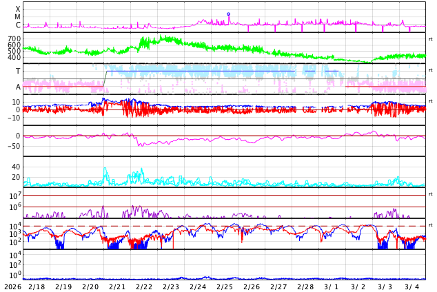 GOES衛星の太陽X線強度。赤・橙 = 0.1〜0.8 nm、青・紫 = 0.05〜0.4 nm (c) データ:NOAA/SWPC、作図:宇宙天気ニュース ![]() | ||||||||||||||||||||||||||||||||||||||||||||||||||||||||||||||||||||||||||||||||||||||||||||||||||||||||||||||||||||||||||||||||||||||||||||||||||||||||||||||||||||||||||||||||||||||||||||||||||||||||||||||||||||||||||