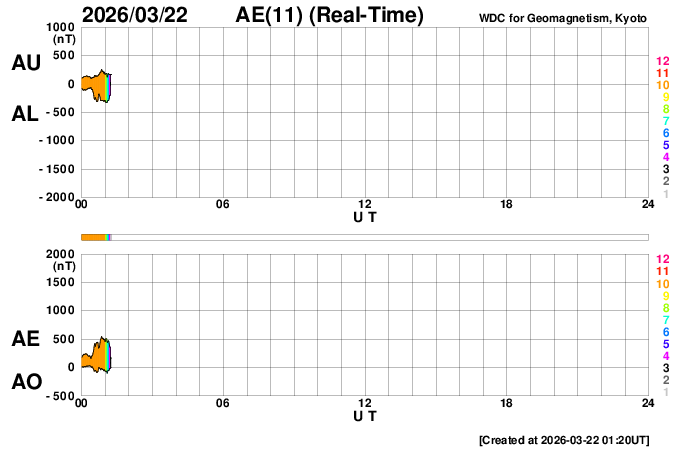 2026/ 3/22 10:40 更新 太陽風は500km/秒と高速の状態が続いています。 担当 篠原 太陽風は、500km/秒と高速の状態が続いています。 磁場強度は、昨日のニュースの後35nTに強まり、 グラフの途中では、40nTに達する変化も発生しています。 その後は下がって行って、現在は8nTとやや強まった程度に戻っています。 ひと段落着いた印象ですが、かなりの強まりが到来しました。 太陽風磁場の南北成分は、 グラフの前半で -10nT程度の強い南向きの変化が発生しています。 磁気圏の活動も強まって、 AE指数は1500nTに達する大きい変化が発生して、 その後も800nTの中規模の活動が続きました。 その後、磁場の南北成分は北向きに強まる様になり、 +30nTというかなり大きい変化も発生しています。 しかし、北向きになると磁気圏への影響は弱まるため、 AE指数は変化が小規模になっています。 そして、太陽風のグラフの後半になると、 南北成分は0nT付近で小さく南北に変化する様になり、 磁気圏の活動はやや強まって、 AE指数は500nTの変化が発生しています。 磁場強度は下がりましたが、太陽風の速度は高まった状態です。 GOES衛星SUVI 195を見ると、 北半球のコロナホールは全体が西側(右側)に進んだくらいで、 3〜4日くらいは影響が続く可能性があります。 太陽は、X線グラフは目立った変化はなく、 穏やかな状態が続いています。