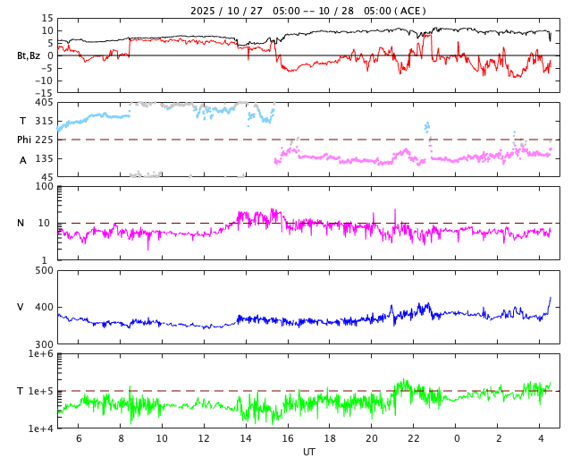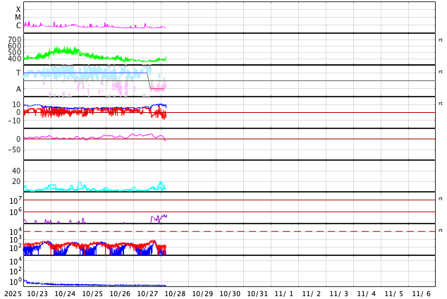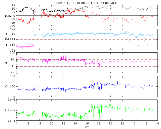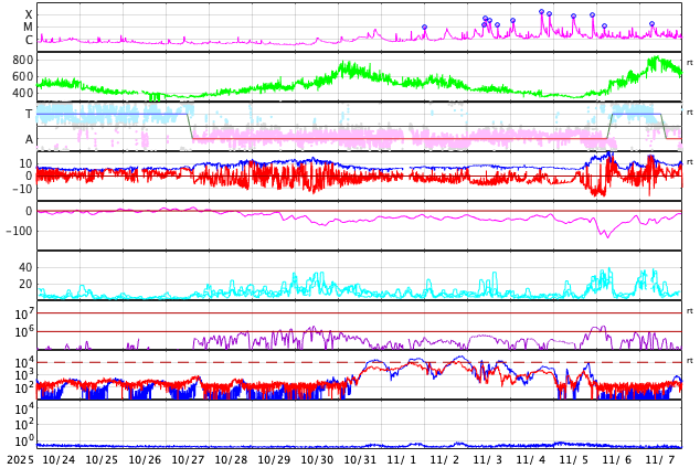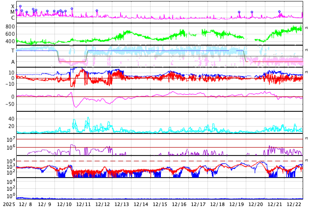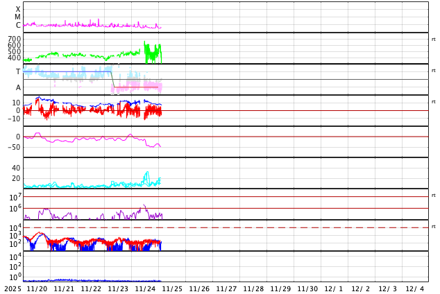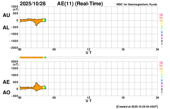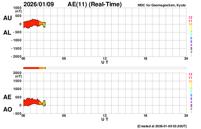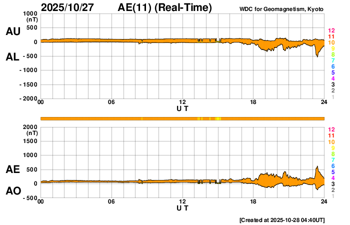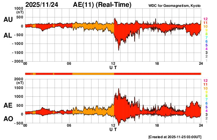 下段のAEグラフの値が高くなると、オーロラ活動が活発化しています。